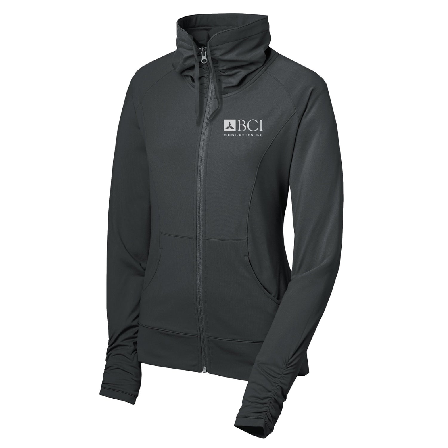 A stretchy, moisture-wicking performance jacket with a soft-brushed backing and unique cowl collar.